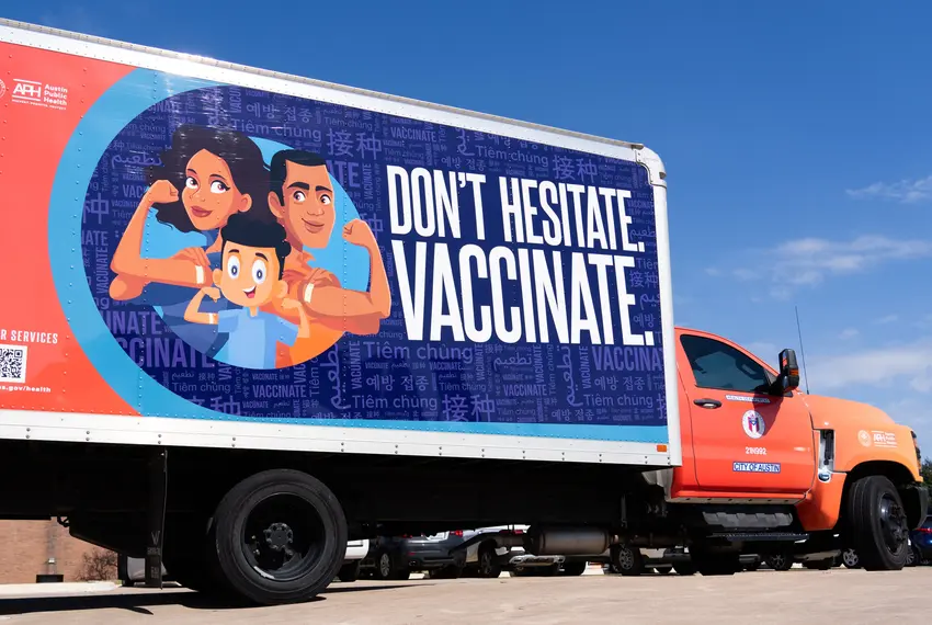 A truck parked outside of the Austin Public Health office at Bergstrom Technology Center on Feb. 28, 2025 encourages vaccinations.